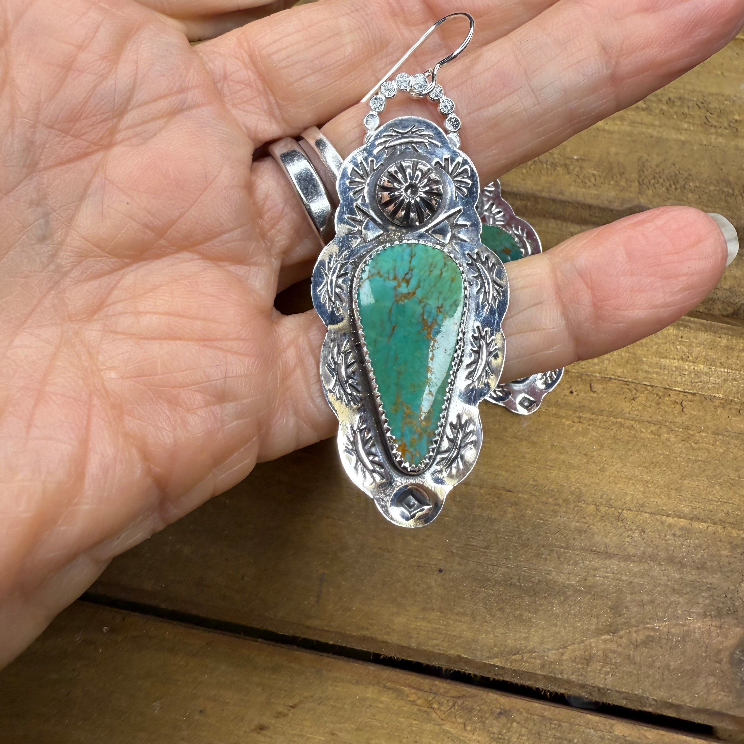 Hand stamped earrings with Kingman Turquoise stones. These measure approximately 2 inches from the top of the ear wires and about 3/4 inches wide